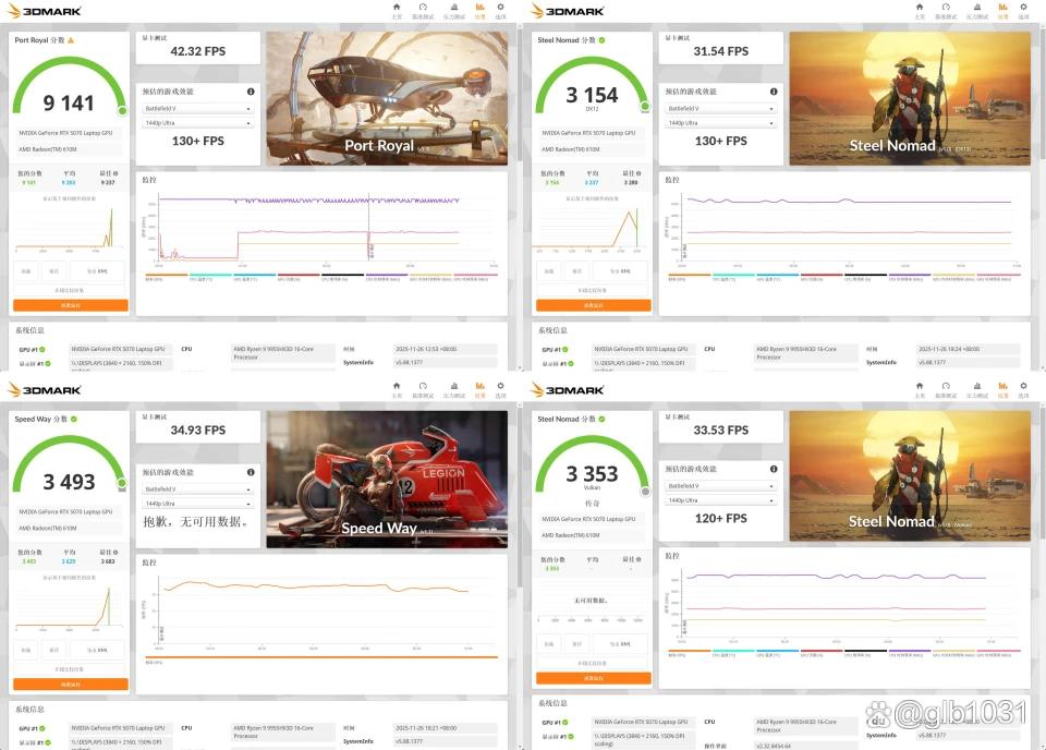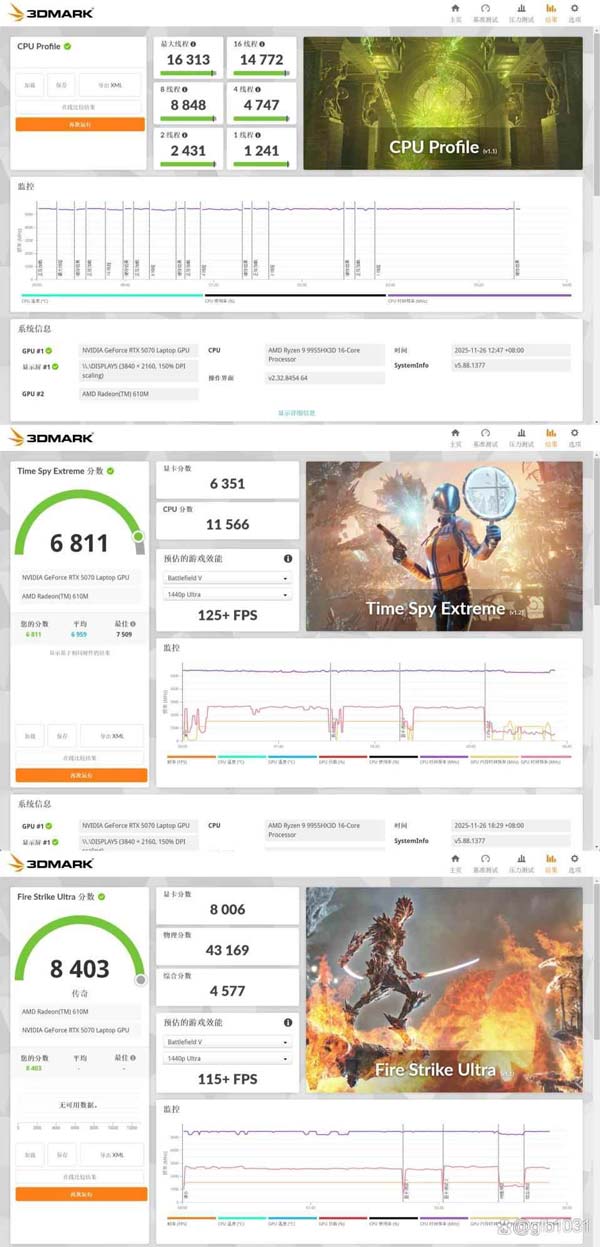 3D Mark显卡测试RTX 5070 Laptop显卡成绩参考,可以看到成绩要比台式机16GB显存的RTX 5060Ti 更高,但是不如台式机的RTX 5070 。
