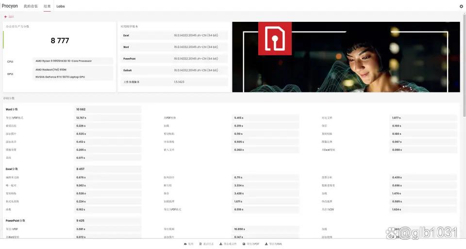 Procyon 测试中的办公生产力测试分数8777,Word 分数10662,Excel 分数8457,PowerPoint 分数 9425。参考我之前测试9950X3D处理器办公性能表现,竟然还是9955HX3D更强一点。