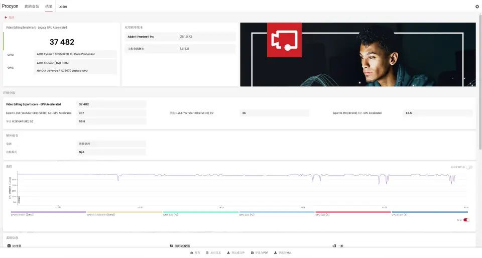 Procyon的生产力测试中,照片编辑基础分数8743,视频编辑基础成绩37482。两个测试都是基于Adobe的PS以及PR 2025版本两款软件测试的,大家可以参考自己配置对比看看。根据我之前的测试经验,目前在图片与视频处理器方面需要补强的部分一定是内存容量与显存容量。玩家到手还是建议升级内存,当然也希望未来可以有5070Ti 或者5080的魔霸9 MINI主机给玩家选择。