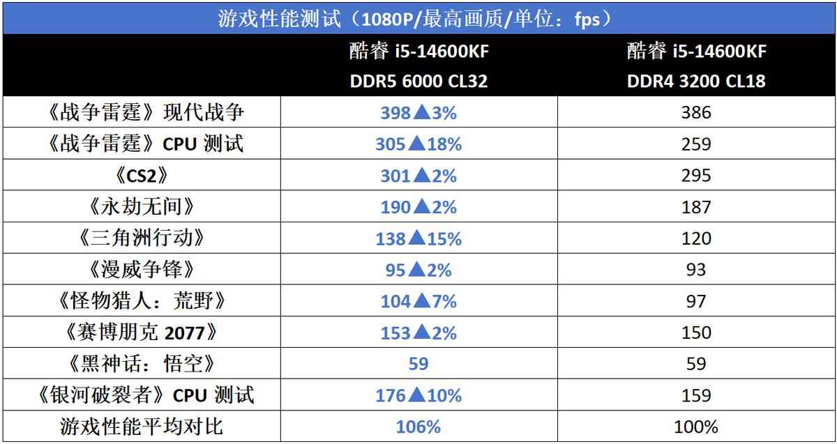 先总结一下上面的测试情况,酷睿i5-14600K+DDR5 6000时无论是内存带宽还是延迟时间都优于酷睿i5-14600K+DDR4 3200。在实际游戏中,得益于大带宽和低延迟,酷睿i5-14600K+DDR5 6000可以获得最高18%的游戏帧率领先,游戏性能平均领先6%。可以说在在性能上,酷睿i5-14600K+DDR5 6000的表现完胜酷睿i5-14600K+DDR4 3200。