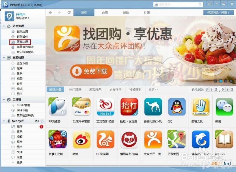 3、打开安装好的pp助手,选择正版应用进行下载:下载后安装程序即可。