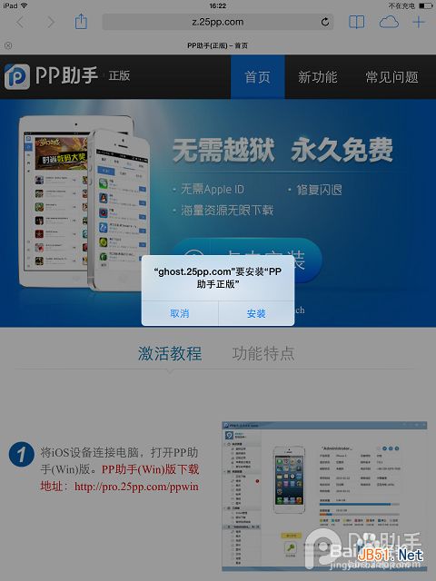 4、除了电脑端的PP助手,现在没有越狱的设备也可以通过iOS版的PP助手正版来直接下载和安装程序了,首先打开iPad上的safari浏览器,在地址栏输入网址:z.25pp.com,点击安装。
