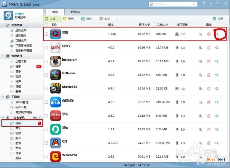 2、安装完毕之后,点击程序---找到快播---右边的放大镜按钮