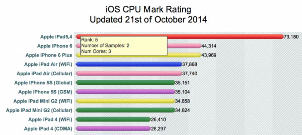 根据 Primate Labs 的创始人 John Poole,图片中的结果真实性很高。iPad Air 2 将搭载三核 A8X 处理器,主频为1.5GHz,配合2GB 运行内存。iPhone 6 和 6 Plus 中的 A8 处理器主频要比 A8X 慢100MHz,而 iPad Air 2的单核模式性能跑分结果要比 iPhone 6 和 6 Plus 高13%,多核性能跑分要比 iPhone 系列高55%。
