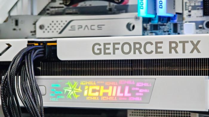 显卡在PCB一侧将金属背板进行弯折覆盖,提供更好的抗弯保护。侧面还配备了单个8-Pin供电接口,以及下部iCHILL元素灯箱与控制按键,延续iCHILL系列的光效潮流。