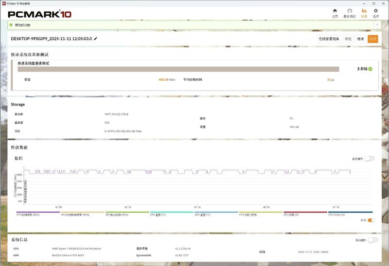 PCMark 10快速系统盘基准测试得分3816分,带宽458MB/s、平均存取时间33微秒。