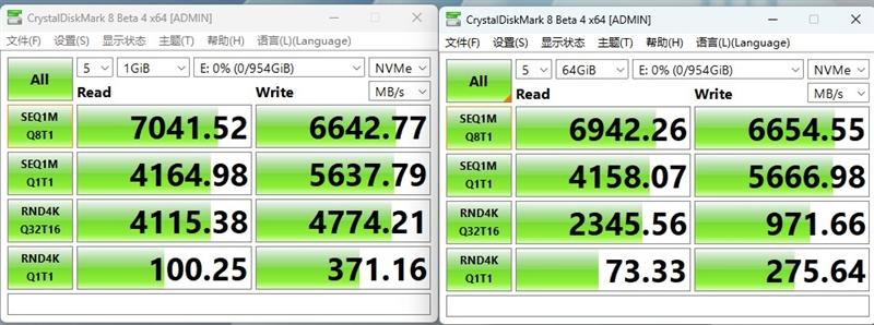 右边是64GB的测试,顺序读取速度6981MB/s、写入6665MB/s,4K随机读取59MB/s、写入193MB/s。