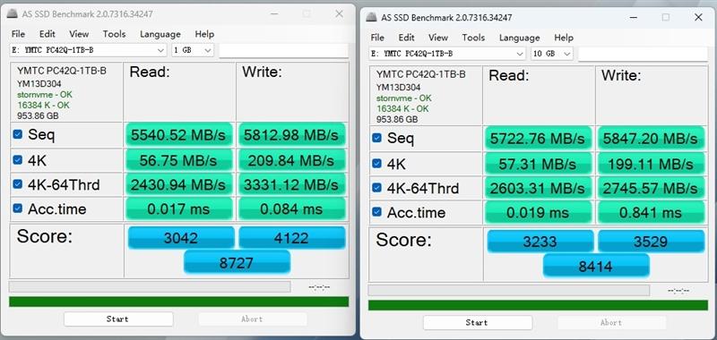 左边是1GB容量的测试。在AS SSD Benchmark的测试中,PC42Q 1TB得分为8727分。顺序读写速度分别为5540MB/s、5812MB/s,4K读写速度则是56MB/s、209MB/s。