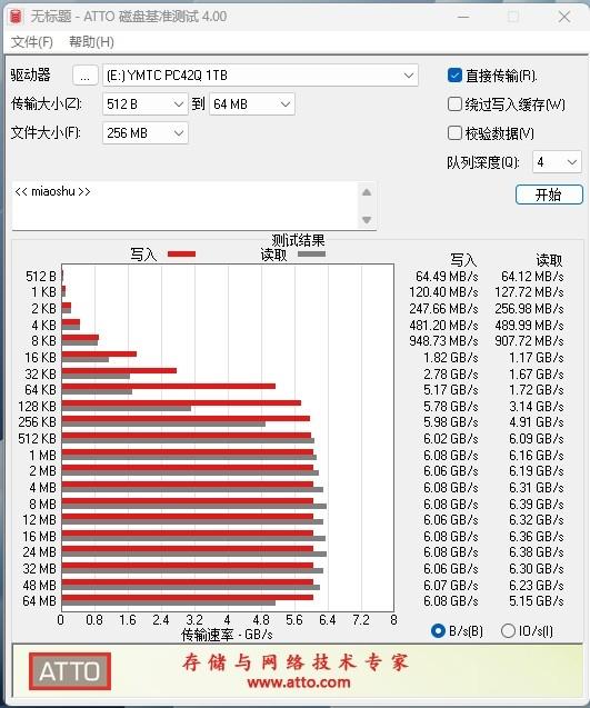ATTO Disk Benchmarks结果来看,对于0.5KB的小文件读写,PC42Q 1TB能达到64MB/s的写入速度和64MB/s的读取速度。