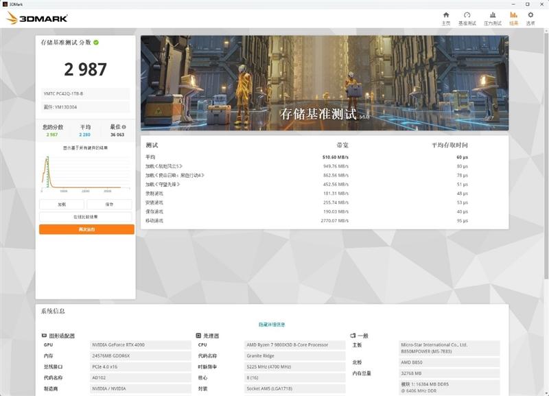 3DMark存储测试主要是测试游戏读写表现,ARES Pro 4TB SSD总分是2987分,延迟60微秒,移动游戏带宽2770MB/s。