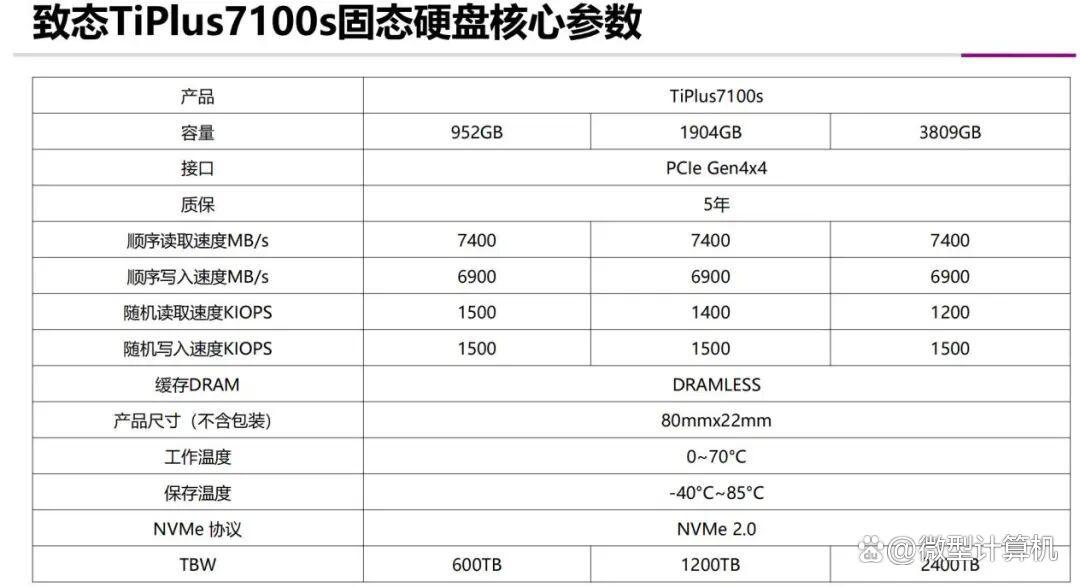 ▲三款不同容量的致态TiPlus7100s固态硬盘详细技术规格