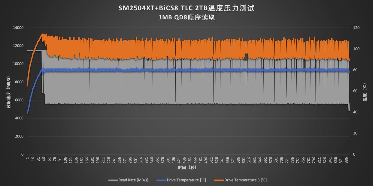 温度压力测试在室温25度,无散热片,被动散热条件下使用IOMeter进行(1MB QD8T1顺序读取),以考察SSD在连续高负载条件下的温控机制。满载测试开始后49秒,SSD首次触发过热限速。读取速度在5.6GB/s到11.5GB/s之间波动。现阶段,PCIe 5.0 SSD要想完全摆脱散热片还是有难度的,但将不再像之前一些旗舰级PCIe 5.0 SSD那样依赖风扇+散热片的主动散热方式。