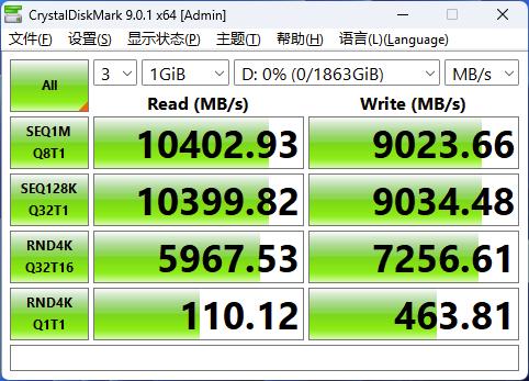 下图是作为对照的铠侠VD10 2TB测速结果,它使用的是群联PS5031-E31T主控方案,搭配铠侠BiCS8 TLC闪存。
