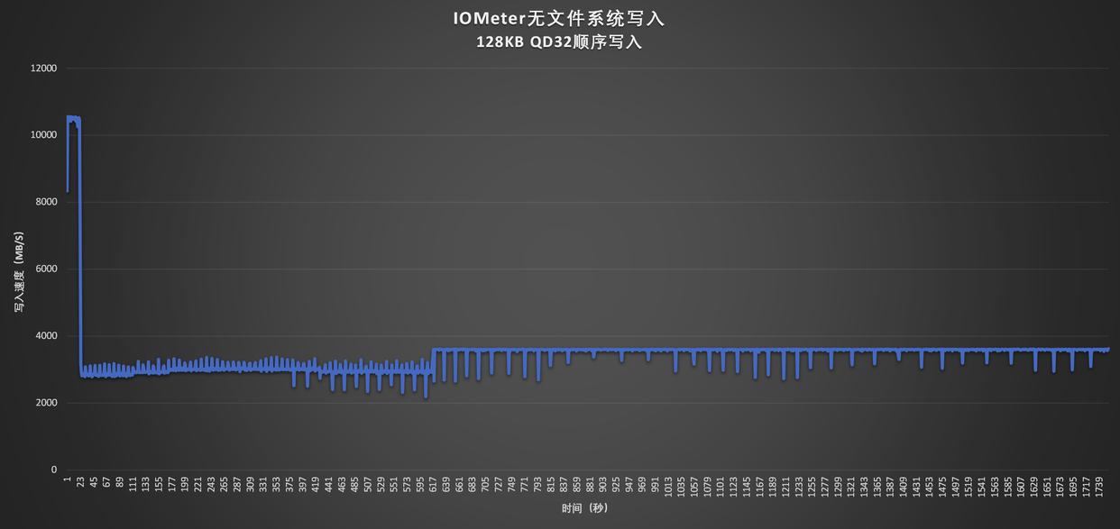 在无文件系统条件下使用IOMeter进行128KB QD32顺序写入测试30分钟,每秒记录。在空盘条件下慧荣SM2504XT+BiCS8 TLC 2TB可提供大约236GB的SLC写入缓存空间。闪存的直写能力约为3580MB/s,性能表现非常好。