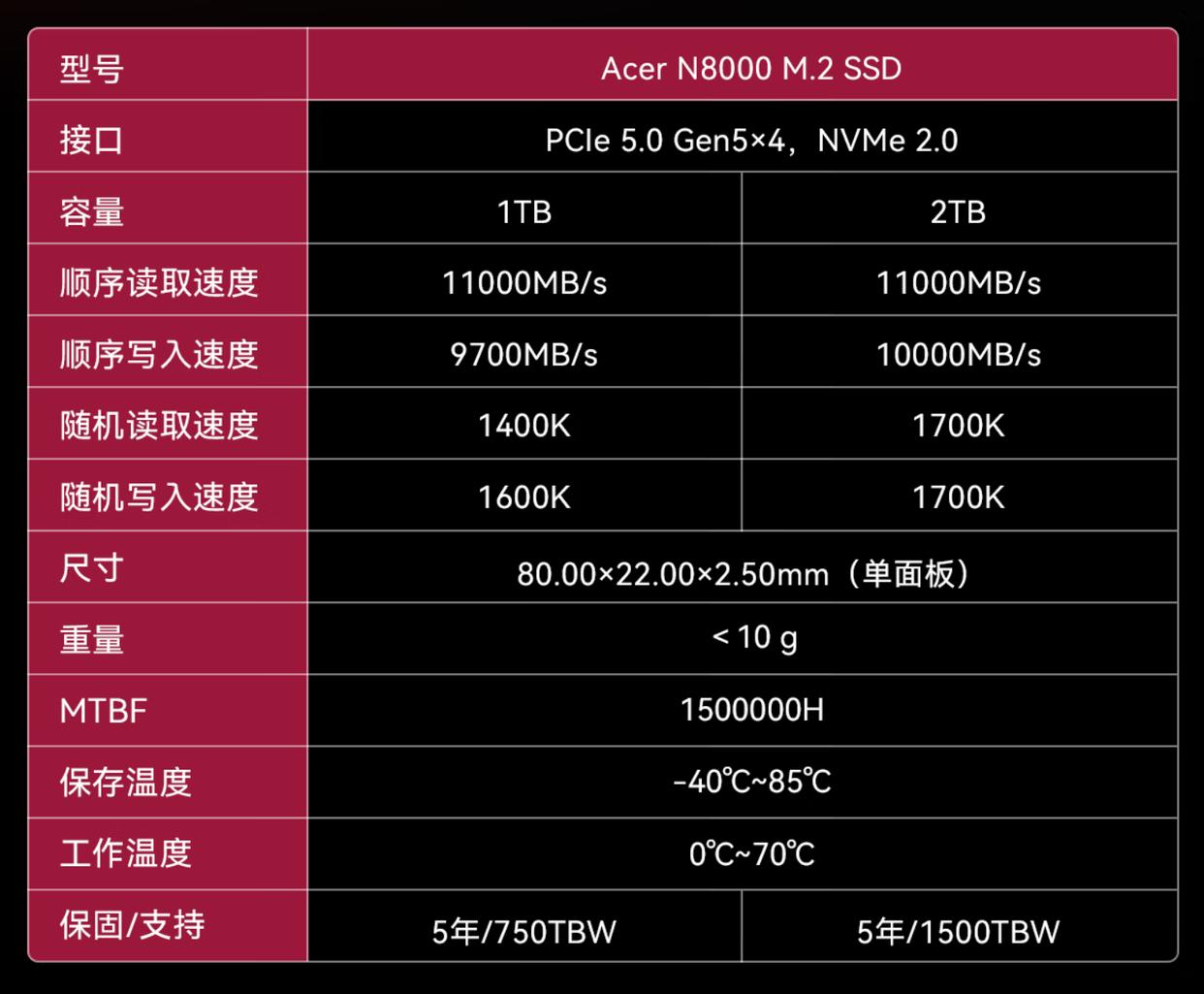 规格方面,ACER N8000提供1TB、2TB两种容量选择,均支持PCIe 5.0 x4高速通道与NVMe 2.0接口协议,其中1TB版本顺序读取速度最高可达11000MB/s,顺序写入速度9700MB/s,随机读写性能分别为1400K IOPS和1600K IOPS;2TB版本顺序写入速度提升至10000MB/s,随机读写性能均达到1700K IOPS,较PCIe 4.0旗舰产品实现近乎翻倍的性能提升。