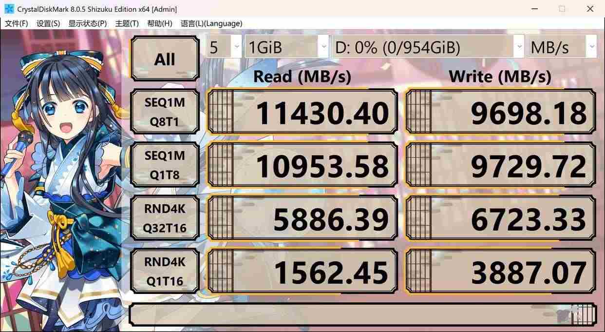 CrystalDiskMark测试中,ACER N8000 1TB版本顺序读取速度达到11430MB/s,顺序写入速度9698MB/s,与官方标称的11000MB/s和9700MB/s基本相符,表现十分亮眼。相较于PCIe 4.0 SSD,读取速度近乎翻倍,PCIe5.0的带宽优势在高速读写场景中体现得淋漓尽致。