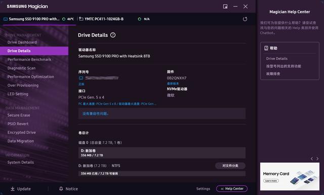 三星魔术师(Magician)功能丰富,支持三星品牌旗下所有的存储产品。例如它可以显示三星9100 PRO 8TB的序列号、固件版本信息,还能查看你的三星品牌存储是否为正品。除此之外还能进行固件升级、安全擦除等操作,强烈推荐大家安装。