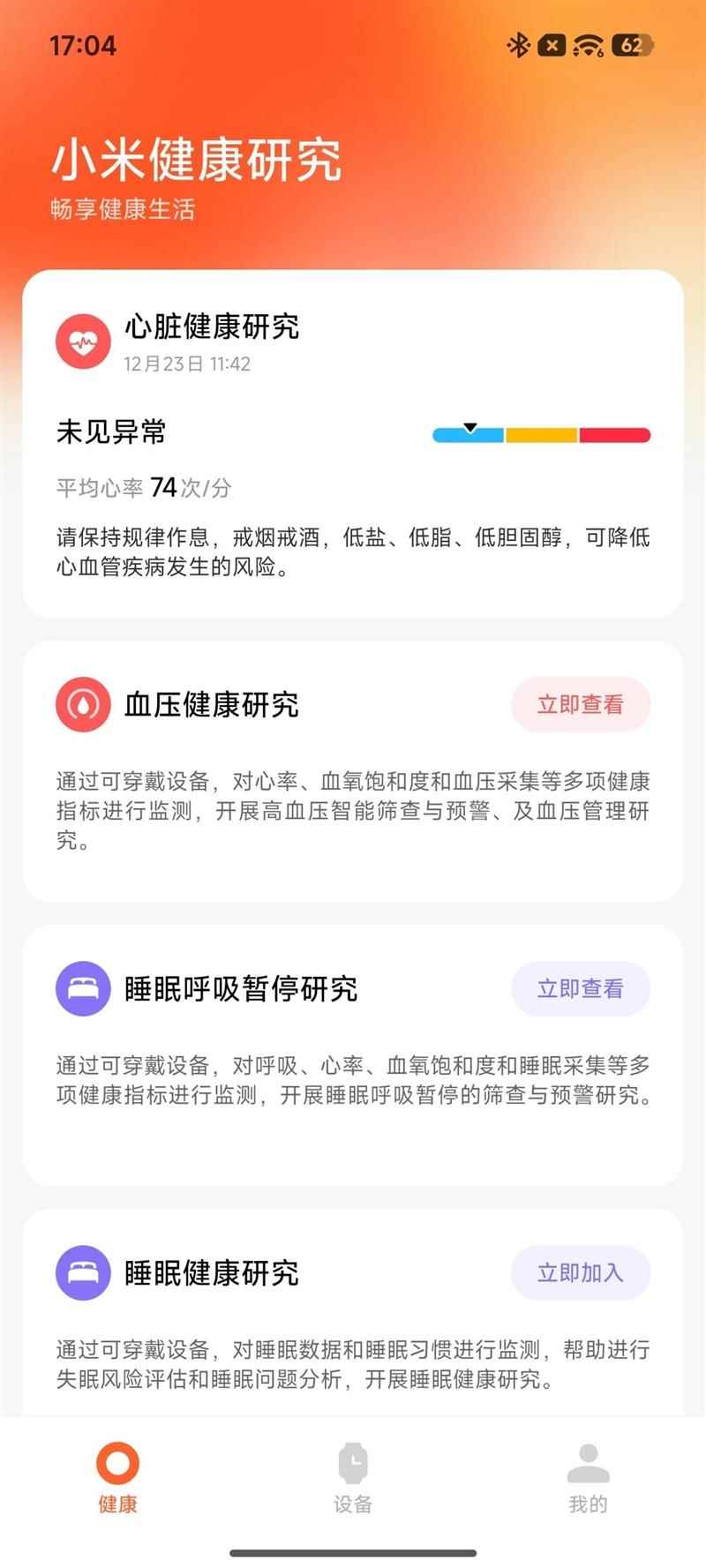 除了ECG专业心电分析之外,小米健康研究APP中还提供了血压健康研究,睡眠健康研究等功能。