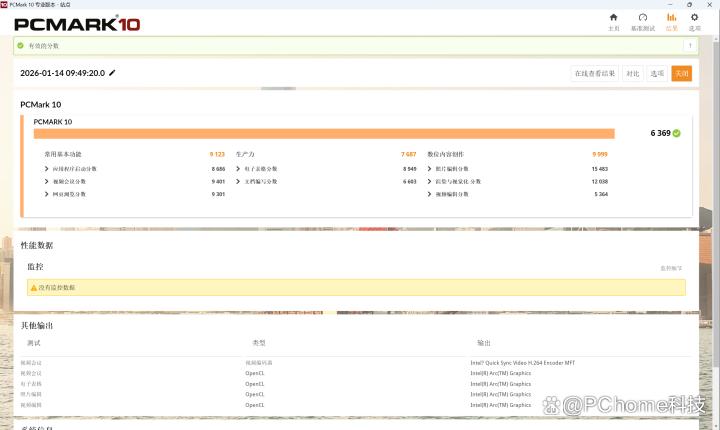 在业内通用的PCMARK10基准测试中,分数可达6369分。其中常用基本功能9123分,生产力方面7687分,其中数位内容创作分数最高,可到9999分。
