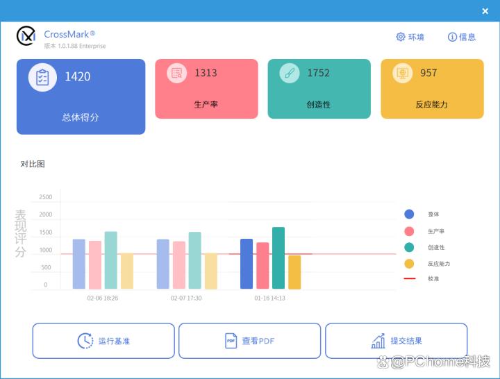 在跨平台的CrossMark生产力测试中,此次测试平台的总体得分可达1420分,其中在创造性上的单项得分达到了1752分,生产率单项可达1313分,反应能力可达957分,足以满足游戏之外绝大多数生产力工作的需求。