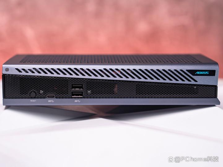 外观正面采用菱形网格面板,兼顾散热通风与视觉质感,RGB灯效藏在面板边缘,可通过技嘉控制中心自定义光效模式,灯光无论是大小、位置还是效果都十分低调不刺眼。机身外壳采用高强度材质,表面经过磨砂处理,不易沾染指纹,显卡坞四角采用圆润化处理,摆放与握持时更加精致。