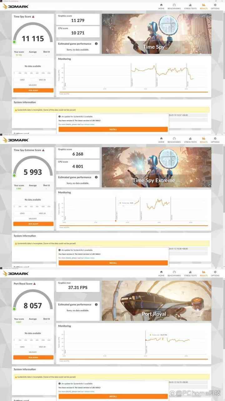 首先在性能测试中,使用业内通用的3Dmark软件来进行测试。包括FHD分辨率下的Fire Strike测试、2K分辨率的Fire Strike Extreme测试和针对4K游戏的Fire Strike Ultra等三个场景,以及针对DX12的TimeSpy与TimeSpy Extreme测试和Port Royal光线追踪测试。