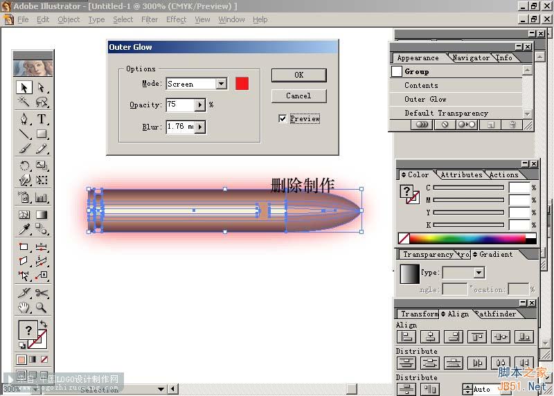 15.选中所有物体,按CTRL+g进行群组,接着打开菜单Effect/stylize/Outer Glow,进行外发光设置,选中previwe选项,可以进行效果预览。这样子弹的效果就完成了。