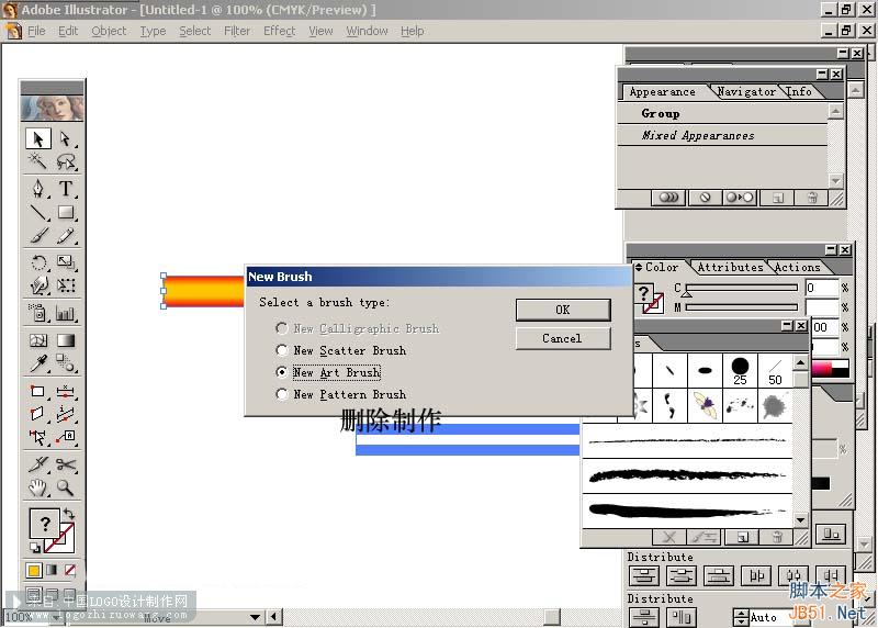 18.按F5打开笔刷面版,将被扩展后的混合物直接拖进笔刷面版,在跳出的对话框里选择new art brush,按OK后会跳出一个笔刷方向及名称的对话框,继续按OK按钮,定义完笔刷,这个时候就会在笔刷面板里多了我们刚才定义的笔刷。