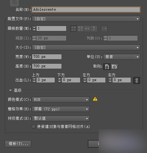 初始设置,简化工作新建文档(Ctrl+N),大小随意,这里是700*700px,RGB,分辨率72,新建对象与像素网格对齐不勾选。