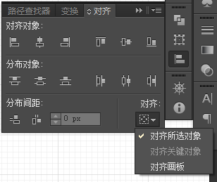 关于对齐的问题:在对齐面板的右上角可以选择显示选项,就会出现如图所示的选项,对齐所选对象,对齐关键对象,对齐画板。若要使几个对象的间隔指定数值,可使用分格间距功能。