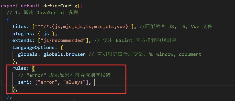 extends: ["js/recommended"], // 使用 ESLint 官方推荐的规则集,很多规则配置好的,就不需要一个个写了,官方地址:https://eslint.org/docs/latest/rules/