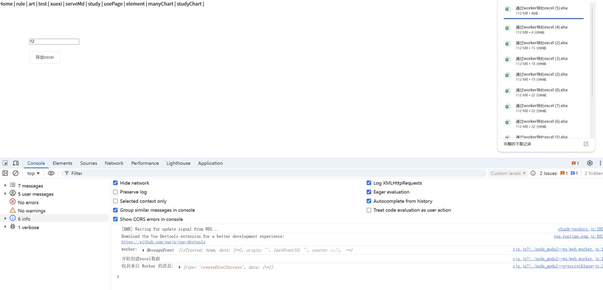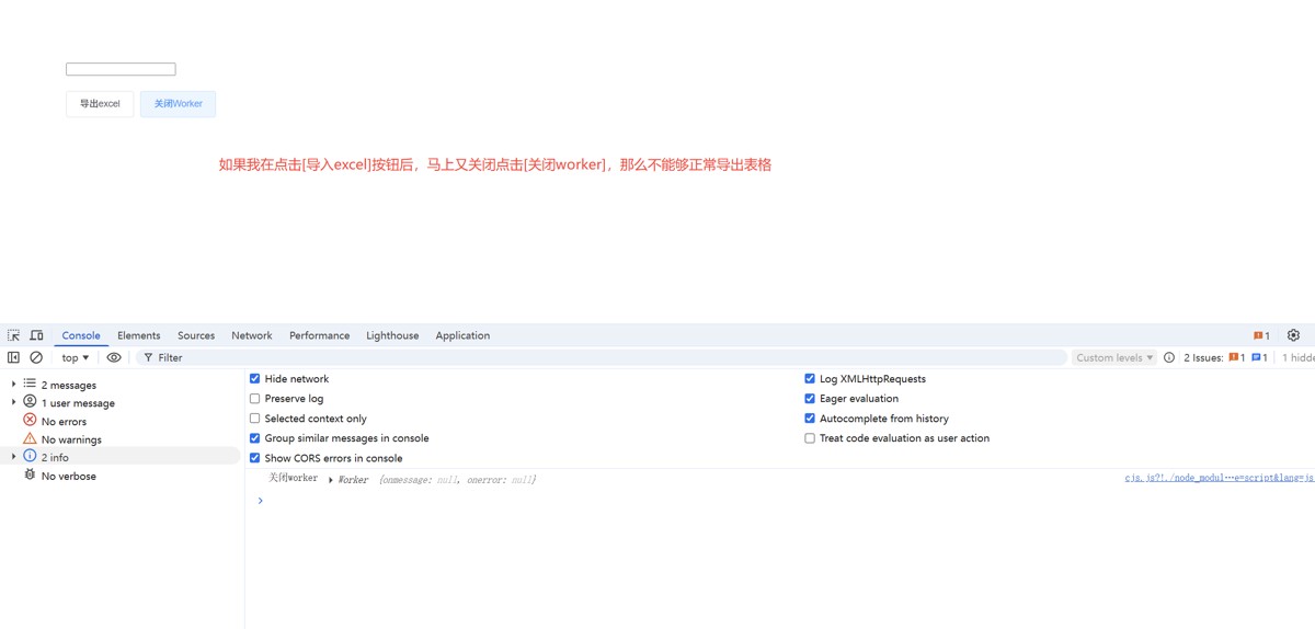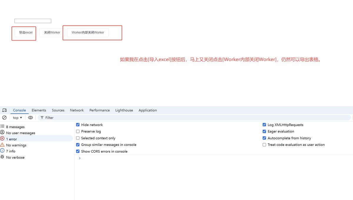 也就是说:如果我在点击[导入excel]按钮后,马上又关闭点击[Worker内部关闭Worker],仍然可以导出表格。