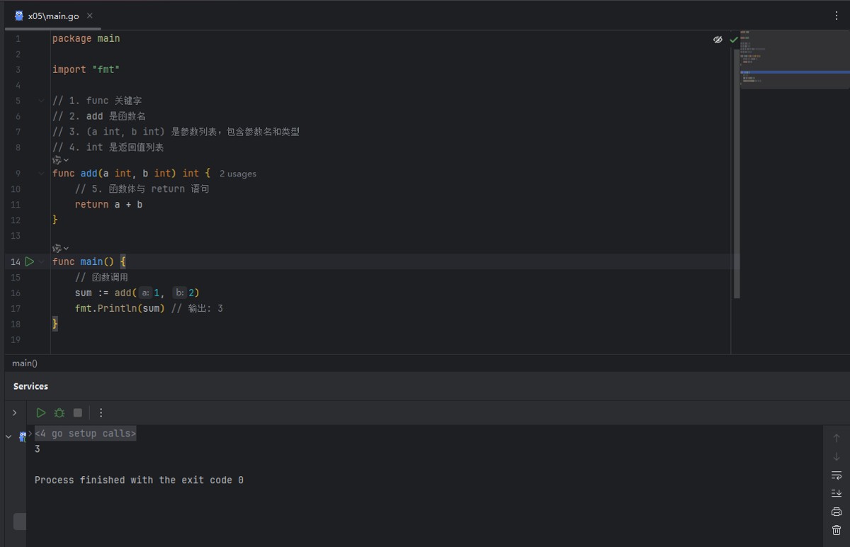 我们定义一个简单的加法函数 add。它接收两个 int 类型的参数并返回一个 int 类型的结果。