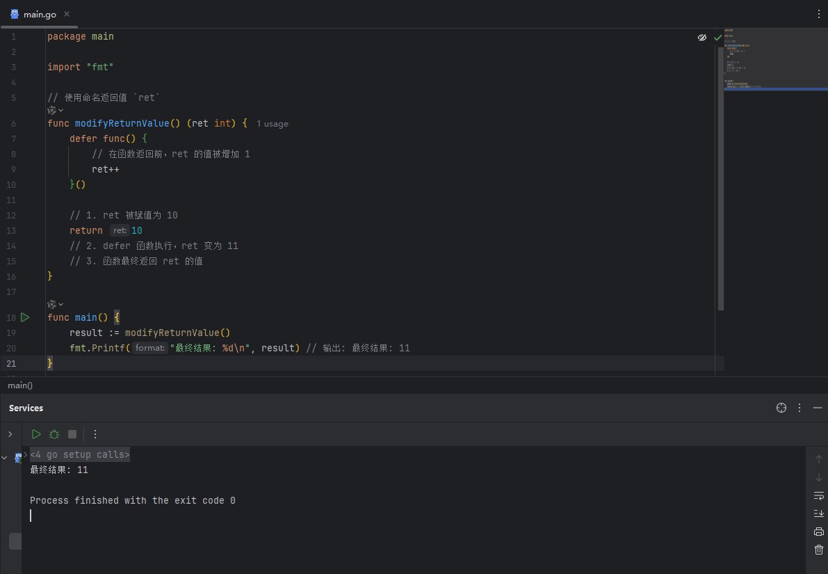 defer中的匿名函数。该函数访问并修改了ret,使其值变为11。最后,函数将