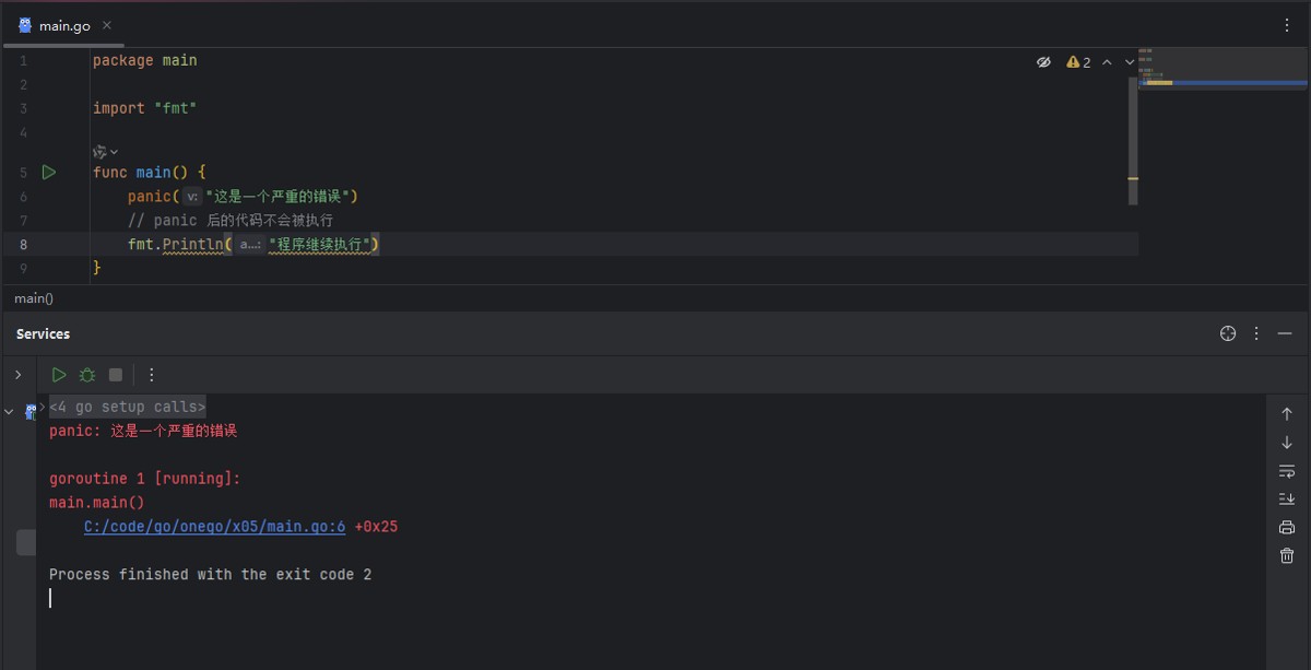 panic 是一个内置函数,用于触发一个panic。当程序遇到一个无法恢复的严重错误时(例如,关键依赖项初始化失败),可以调用 panic 来立即中止程序的正常执行。