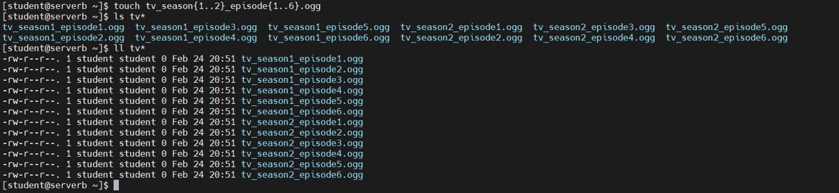 3.创建本实验要使用的一组空白练习文件。使用shell的Tab补全功能可以轻松查找文件路径名。在/home/student 目录中创建名为tv_seasonX_episodeY.ogg的12个文件。将X替换为季数,Y替换为该季中的集数,共两季,每季六集。