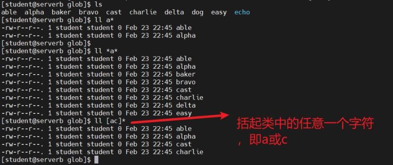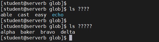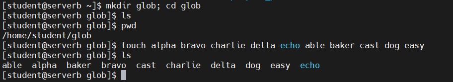 mkdir glob; cd glob touch alpha bravo charlie delta echo able baker cast dog easy