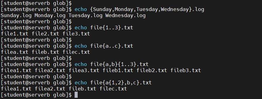 大括号扩展用于生成任意字符串。大括号包含字符串的逗号分隔列表或顺序表达式。结果包含大括号定义之前或之后的文本。大括号扩展可以互相嵌套。也可以使用双点语法(..),将它扩展为一个序列。例如,大括号内的{m..p}双点语法扩展为mnop。