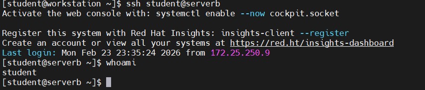 1.使用ssh命令,以student用户身份登录serverb计算机。系统的配置支持使用SSH密钥来进行身份验证。