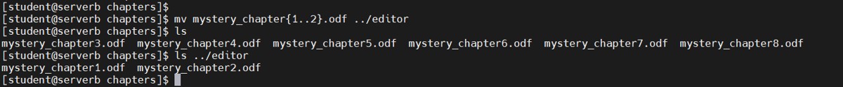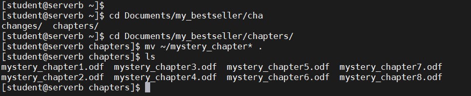 cd Documents/my_bestseller/chapters mv ~/mystery_chapter* . ls