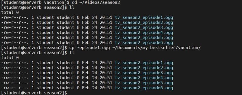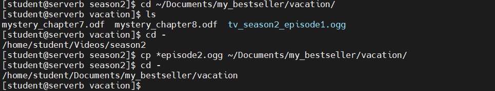 cd ~/Videos/season2 cp *episode1.ogg ~Documents/my_bestseller/vacation