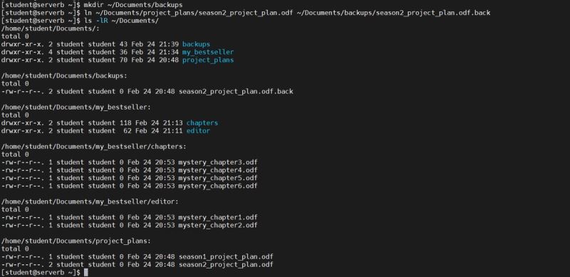 mkdir -p ~/Documents/backups ln ~/Documents/project_plans/season2_project_plan.odf \ ~/Documents/backups/season2_project_plan.odf.back ls -lR ~/Documents/