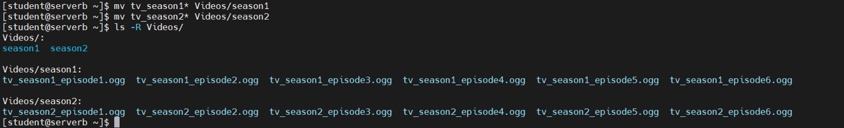 mv tv_season1* Videos/season1 mv tv_season2* Videos/season2 ls -R Videos