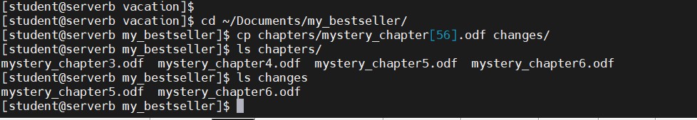 cd ~/Documents/my_bestseller cp chapters/mystery_chapter[56].odf changes ls chapters ls changes
