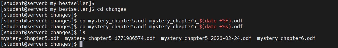 cd changes cp mystery_chapter5.odf mystery_chapter5_$(date +%F).odf cp mystery_chapter5.odf mystery_chapter5_$(date +%s).odf ls