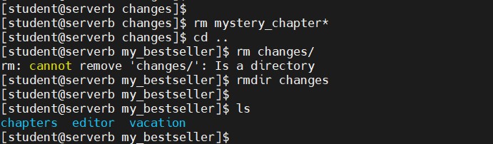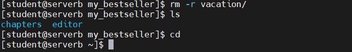 更改到changes目录的父目录。尝试使用rm命令(不带-r递归选项)来删除空目录。此尝试应该会失败。最后,使用rmdir命令删除空目录,而这会成功。度假结束后,您不再需要vacation目录。通过使用rm命令(带递归选项)删除该目录。完成时,返回到student用户的主目录。