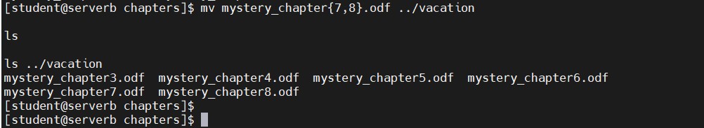 7.3.使用单个命令,将第7章和第8章从chapters目录移到vacation目录。使用带有字符串列表的大括号扩展指定章节文件名,而不使用通配符字符。
