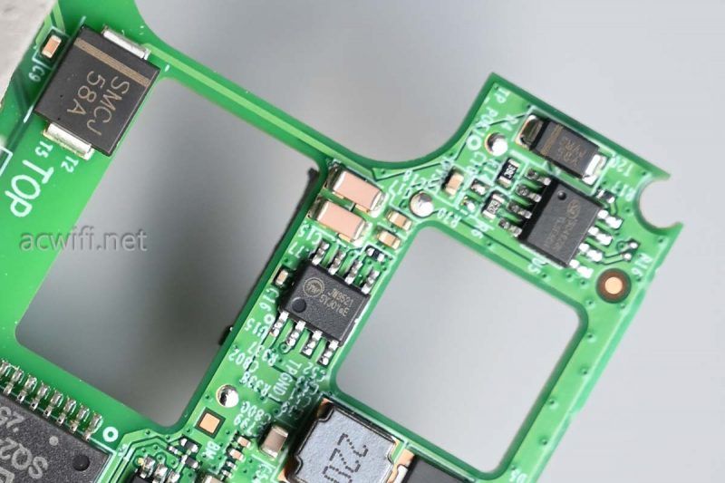靠近CPU的这颗5G无线芯片上面丝印着”T232953N1“,型号是海思的Hi1155,支持IEEE802.11 a/b/g/n/ac/ax/be,支持2x2MIMO,在160MHz频宽和4096-QAM下最高速率2882Mbps。