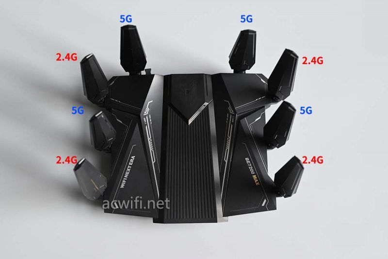 一共外置了8根天线,双频2.4G和5G的天线布局如下: