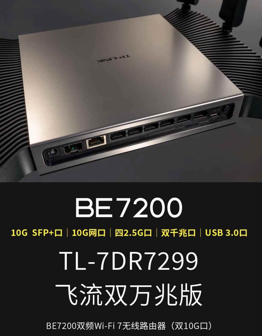 普联 TP-LINK BE7200 飞流双万兆版路由器现已开售,新品采用万兆网口、SFP+ 口设计,支持双频 8 流 Wi-Fi 7,首发售价 999 元。